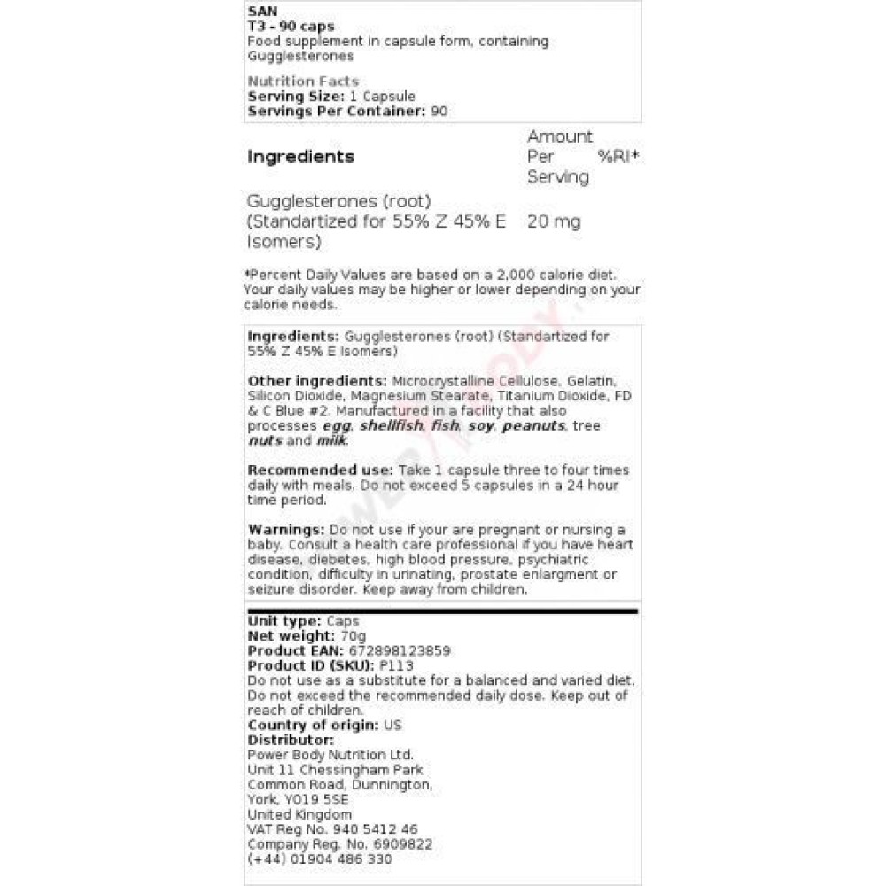| Dawkowanie (medyczne) | 25 mg guggulsteronów trzy razy dziennie |